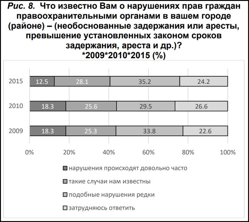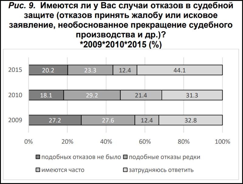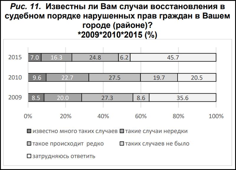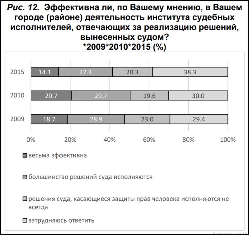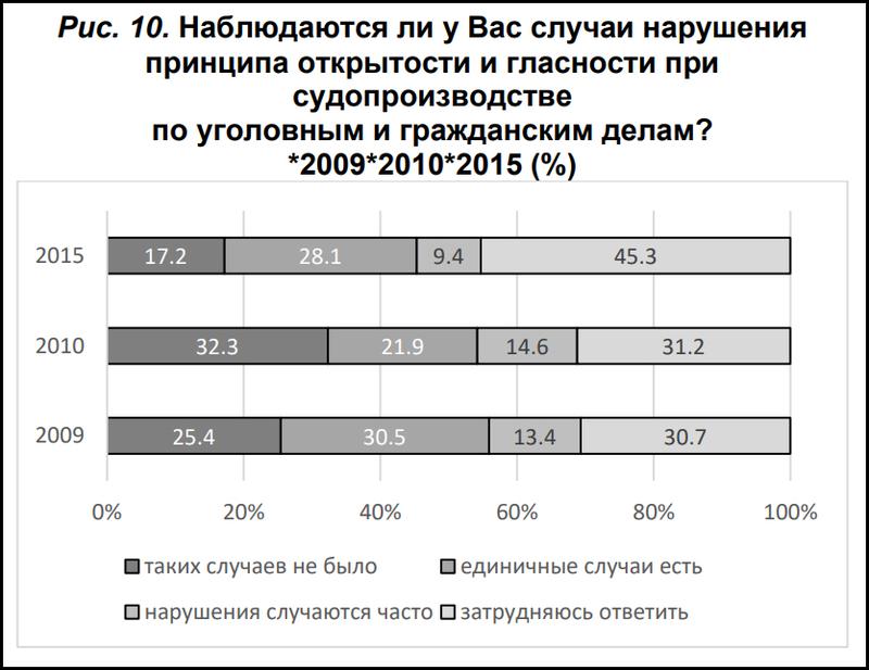 «В рассматриваемый период имеются противоречивые мнения относительно судебной защиты граждан, соблюдения принципа открытости и гласности при судопроизводстве по уголовным и гражданским делам, восстановления в судебном порядке нарушенных прав граждан, эффективности деятельность института судебных исполнителей, отвечающих за реализацию решений, вынесенных судом».