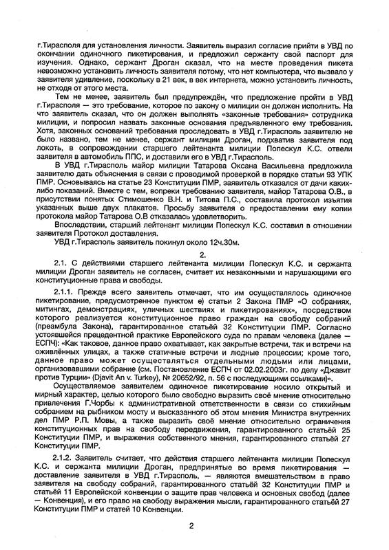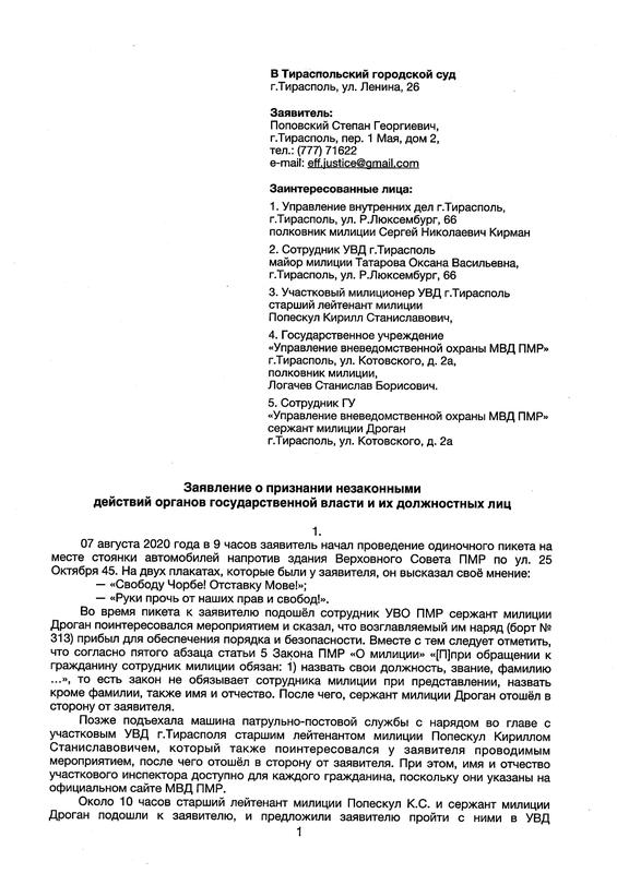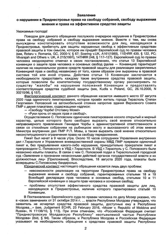 «Поводом для данного обращения послужило очередное нарушение в Приднестровье права на свободу собраний и свободу выражения мнения», — незаконное задержание самого Поповского 7 августа 2020 года во время проведения одиночного пикета.
