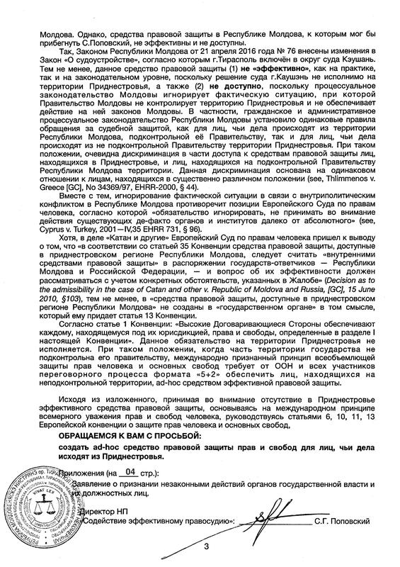 Поповский обращается с просьбой «создать ad-hoc средство правовой защиты» — комиссию для рассмотрение дел, связанных с правами и свободами человека в Приднестровье.